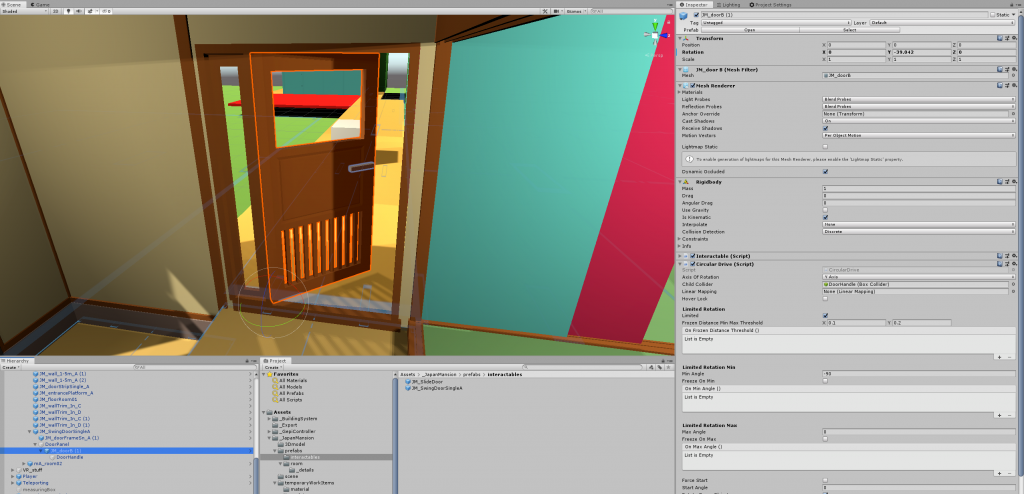 This worked okay for me. The door felt really heavy, like I had to put more energy in opening and closing it. So I add Rigidbody to the door panel itself, and set Angular Drag to 0 (uncheck Use Gravity, and check Is Kinematic). This seems to make it easier to open the door. Maybe I’ll play around with the mass too, we’ll see how it goes.