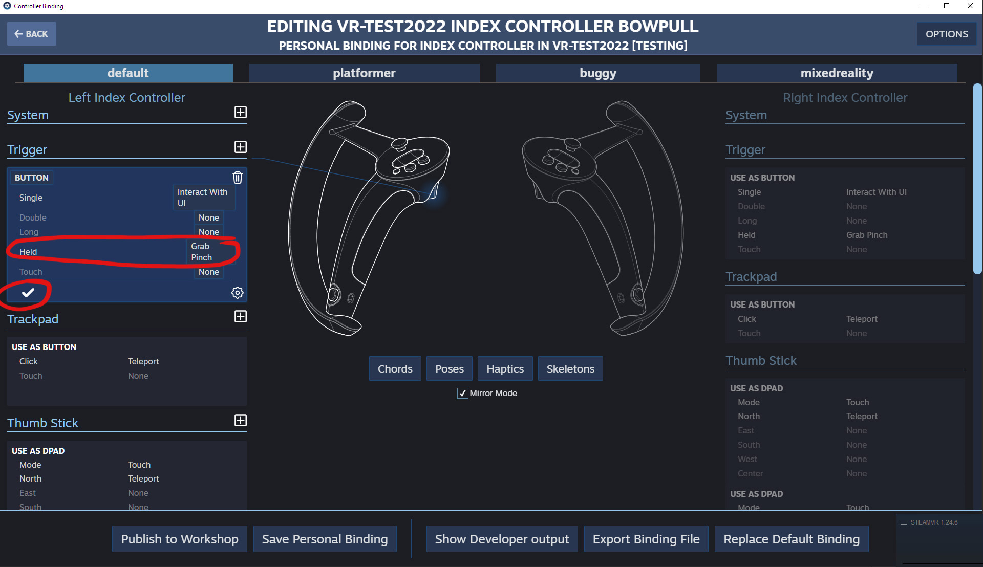 - Export Binding File, name the configuration something and write description. This configuration will be saved in documents/steamvr/input/exports folder as a json file.